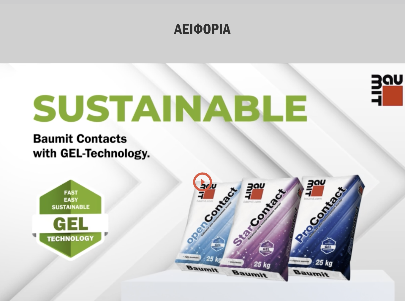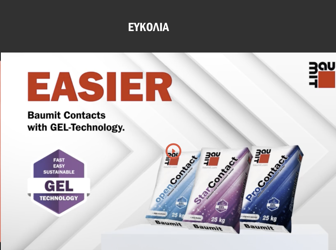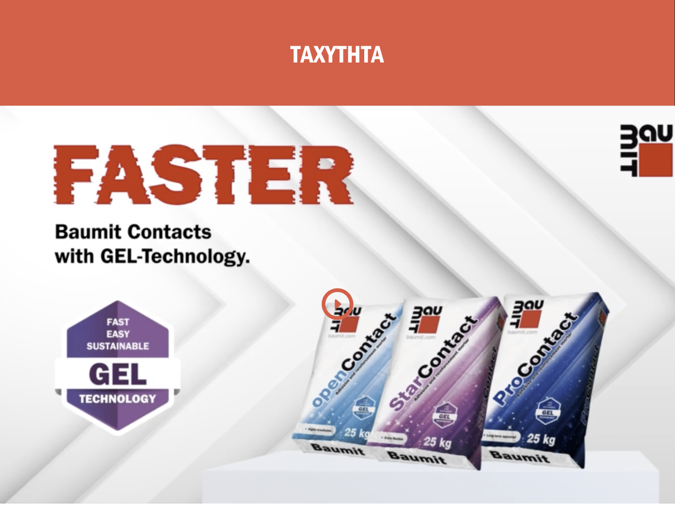 H νέα τεχνολογία GEL των προϊόντων μας είναι αποτέλεσμα της συνεχούς μας έρευνας και ανάπτυξης καινοτομίας, για να σας προσφέρουμε όπως πάντα πρωτοποριακά προϊόντα που διευκολύνουν τη ζωή στα εργοτάξια και επιταχύνουν την ολοκλήρωση των έργων σας. Είναι γεγονός: Με την νέα τεχνολογία GEL πετύχαμε να κάνουμε τα αναγνωρισμένα, για την αξιοπιστία τους, προϊόντα Baumit openContact, Baumit StarContact και Baumit ProContact ασύγκριτα! Πιστέψαμε στο…απίστευτο και σας παρουσιάζουμε την λύση για εφαρμογή με ευκολία, ταχύτητα και αντοχή στον χρόνο. Όλα αυτά, με σεβασμό προς το περιβάλλον, ως διαρκή μας δέσμευση για ένα καλύτερο μέλλον.